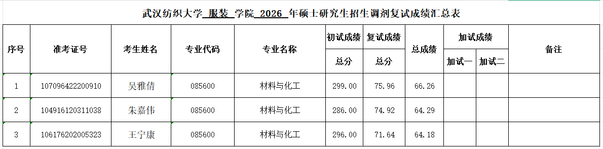 武汉纺织大学服装学院2026年硕士研究生复试成绩公示(调剂第二批)