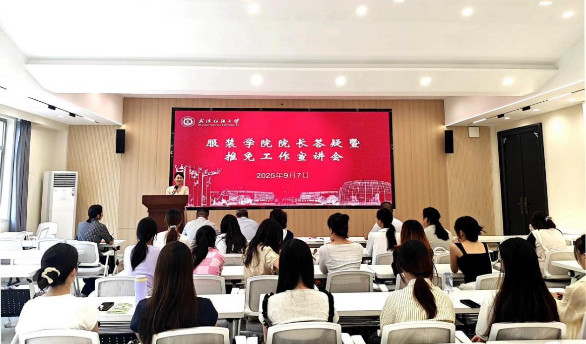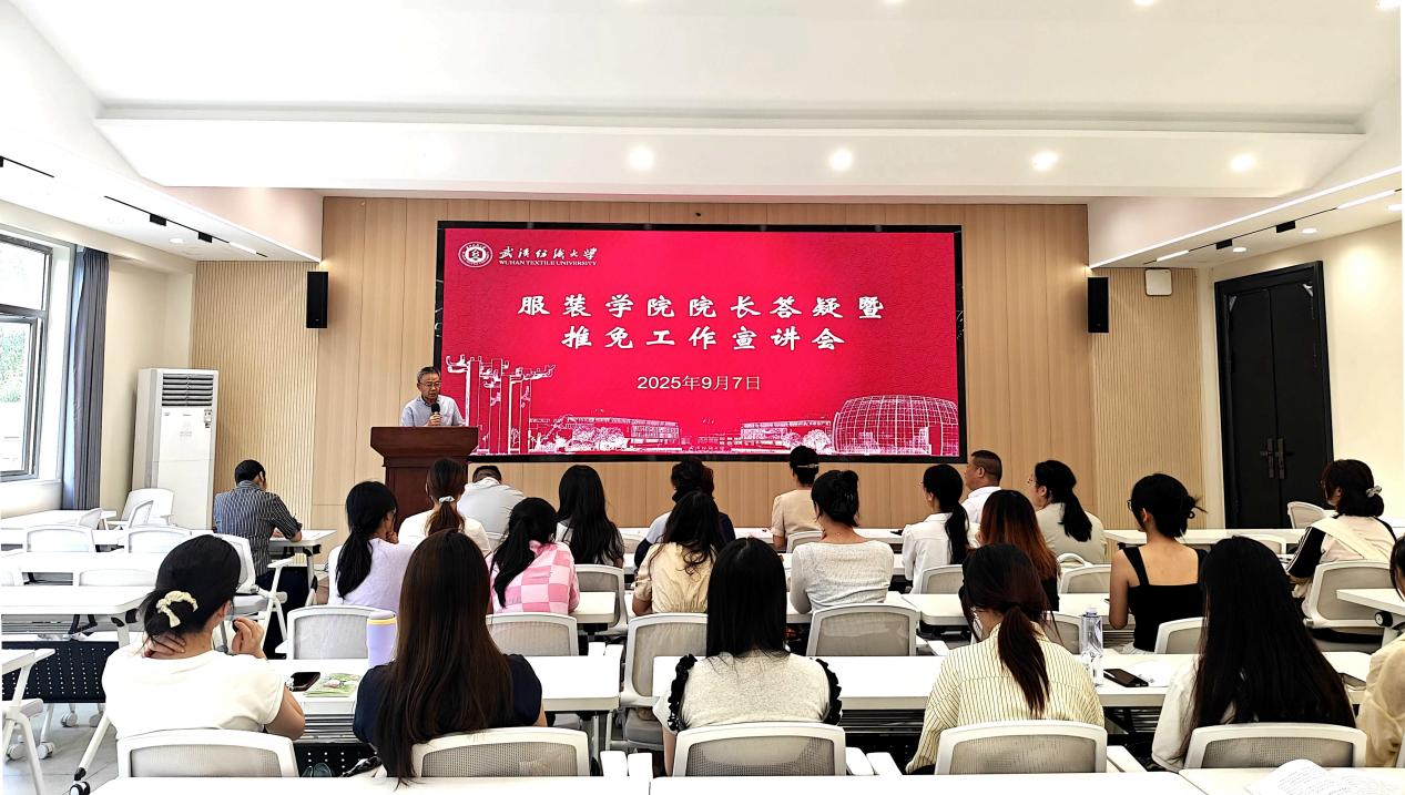 为做好我校推荐2026届优秀应届本科毕业生免试攻读硕士研究生工作,帮助学生深入了解推荐优秀应届本科毕业生免试攻读研究生相关政策,做好推免工作的组织与指导,9月7日下午,服装学院在南湖校区尚知楼2楼学术报告厅举行了院长答疑暨推免工作宣讲会。学院全体领导班子成员,2026届毕业生辅导员及众多有意向参与推免的优秀本科生参加了此次活动。