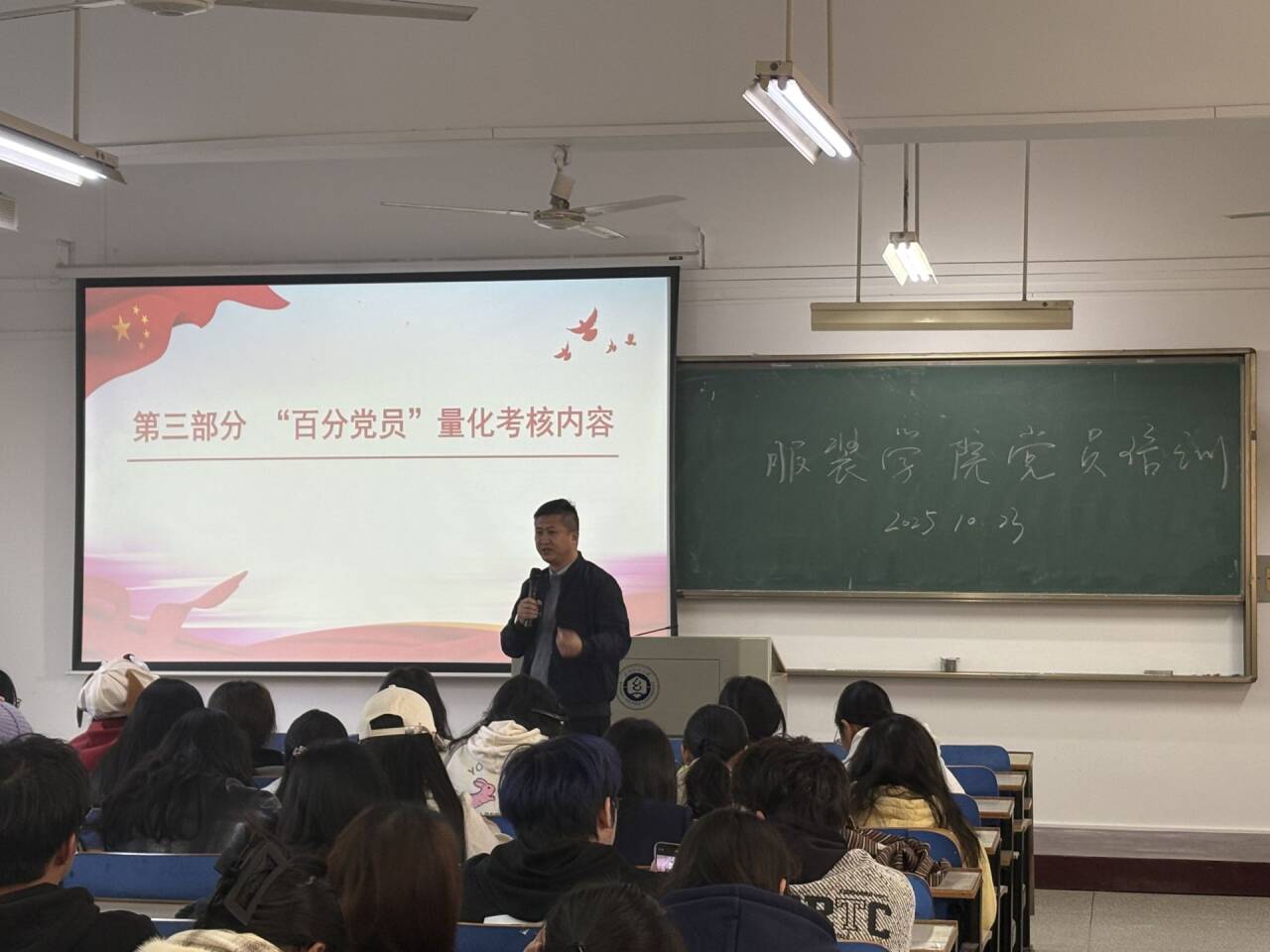 接下来的活动中,学院党委副书记郭泰辰为学院全体学生党员开展专题培训。培训中,郭泰辰围绕党支部委员会设立与职责展开讲解,详细解读了党支部委员会的组成要求、产生流程,以及支部书记、副书记、组织委员、宣传委员、纪检委员的具体职责,强调支委需各司其职、协同发力,筑牢党支部战斗堡垒。此外,培训还聚焦服装学院“百分党员”量化考核内容,明确从政治建设、日常表现、党员先锋作用、激励加分及一票否决五方面进行学期考核,详细说明各项考核标准与分值,引导党员以考核为抓手,主动履行党员义务、积极参与党内活动、发挥先锋模范作用。