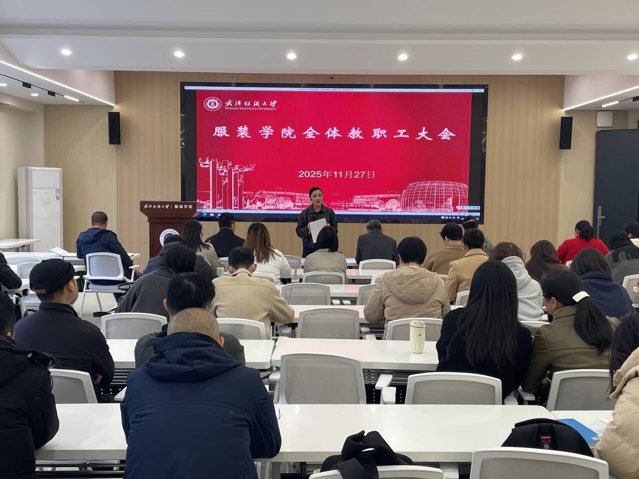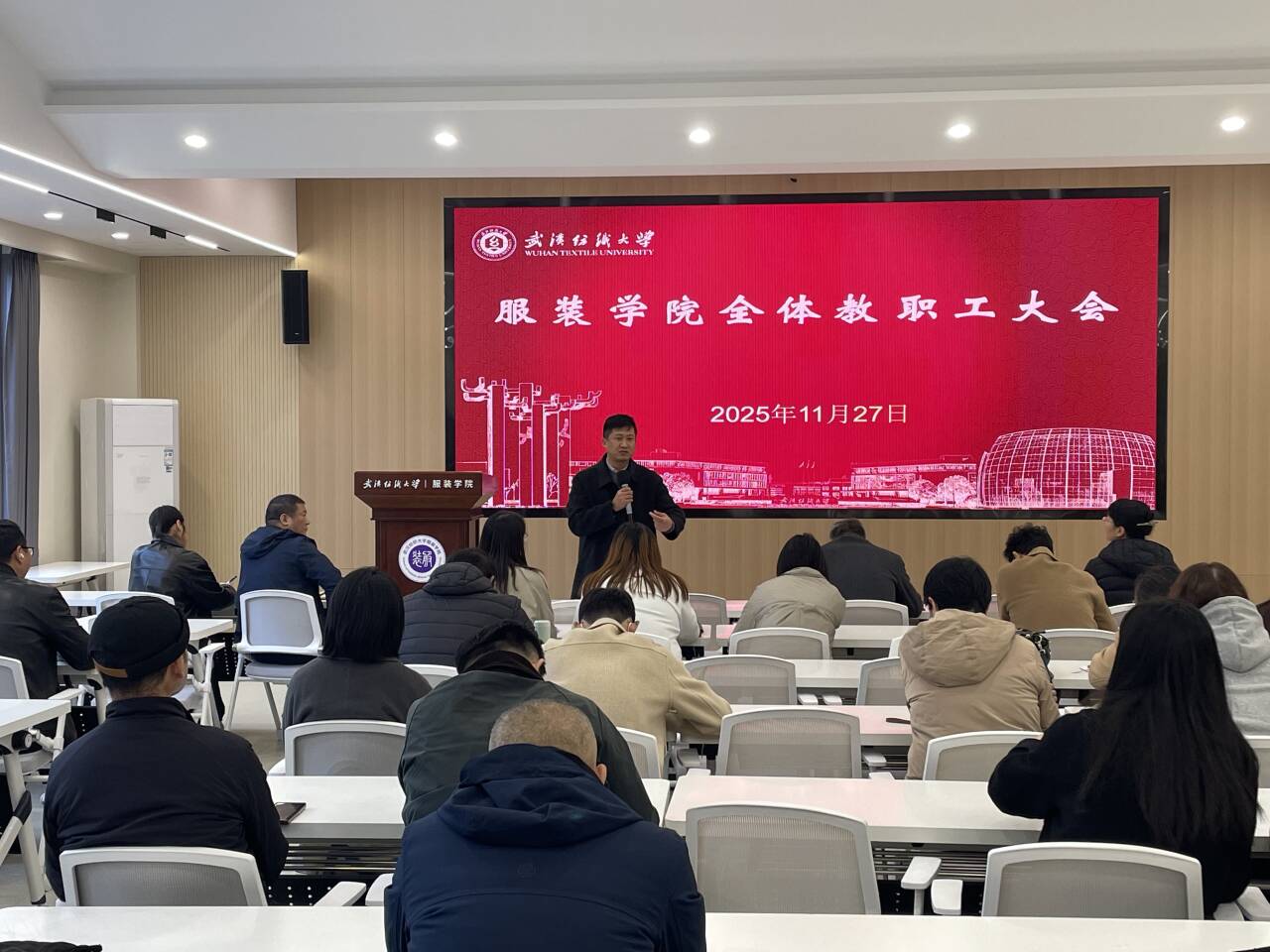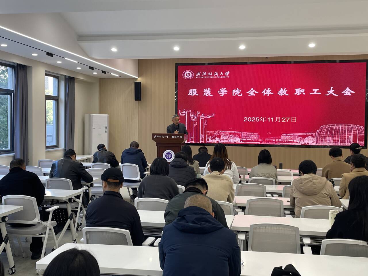 11 月 27 日下午,服装学院在综合楼二楼学术报告厅召开全院教职工大会,学院领导班子成员及全体教职工参会。会议由院长陶辉主持,聚焦教学科研、人才培养、毕业生就业以及学生安全稳定等核心工作,系统部署近期重点任务,强化责任落实,为学院高质量发展和学校 “双一流” 建设筑牢根基。
