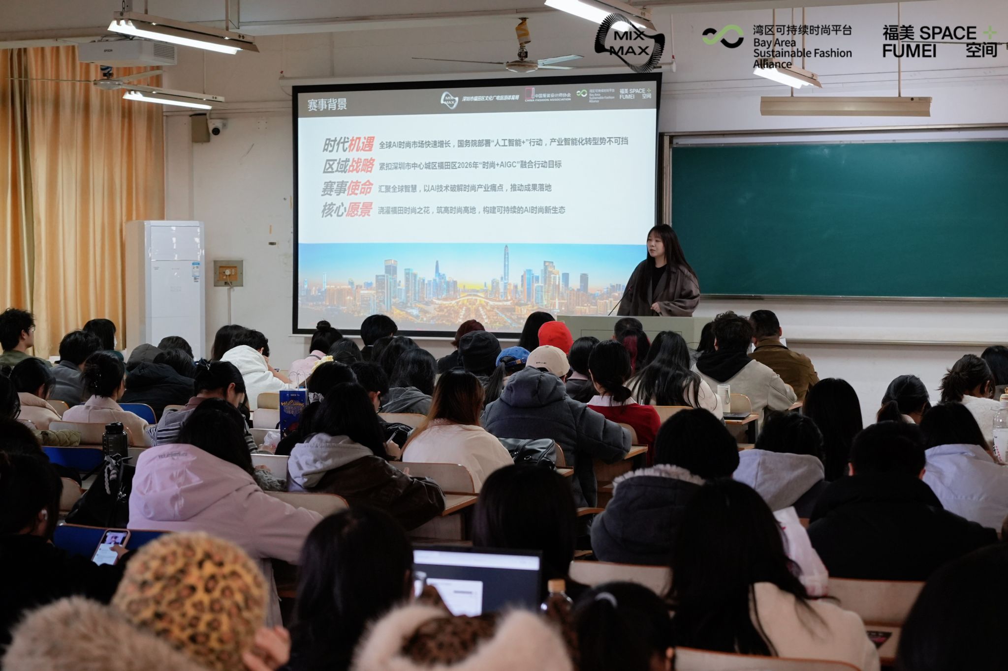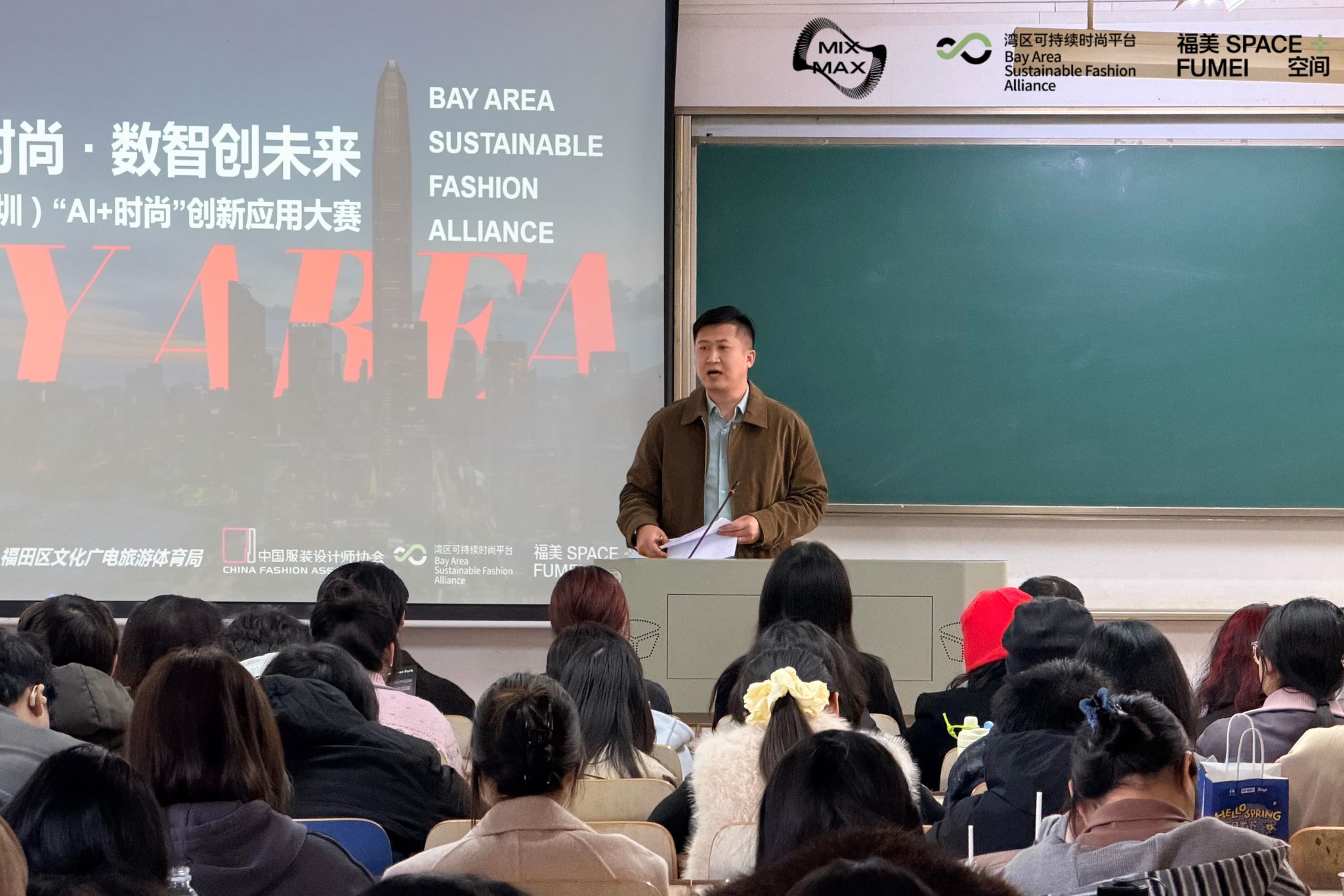 为搭建高校与时尚产业创新对接桥梁,发掘培育“AI+时尚”跨领域复合型人才,3月11日14:30,在综合楼410教室举办首届全球(深圳)“AI+时尚”创新应用大赛专场宣讲会,为我校师生带来赛事全维度解读,吸引了服装学院多个专业学子到场参与。中国服装设计师协会专职副主席朱少芳、中国服装设计师协会产业中心总监王潇、中国服装设计师协会产业中心副总监王星宇、深圳市福美空间创新发展有限公司场景应用部部长莫淏渟、深圳市福美空间创新发展有限公司场景应用部副部长王梓栋、深圳市福美空间创新发展有限公司品牌拓展部刘涛以及服装学院专业老师等领导和嘉宾出席本次宣讲会。此次宣讲会由服装学院党委副书记郭泰辰主持。