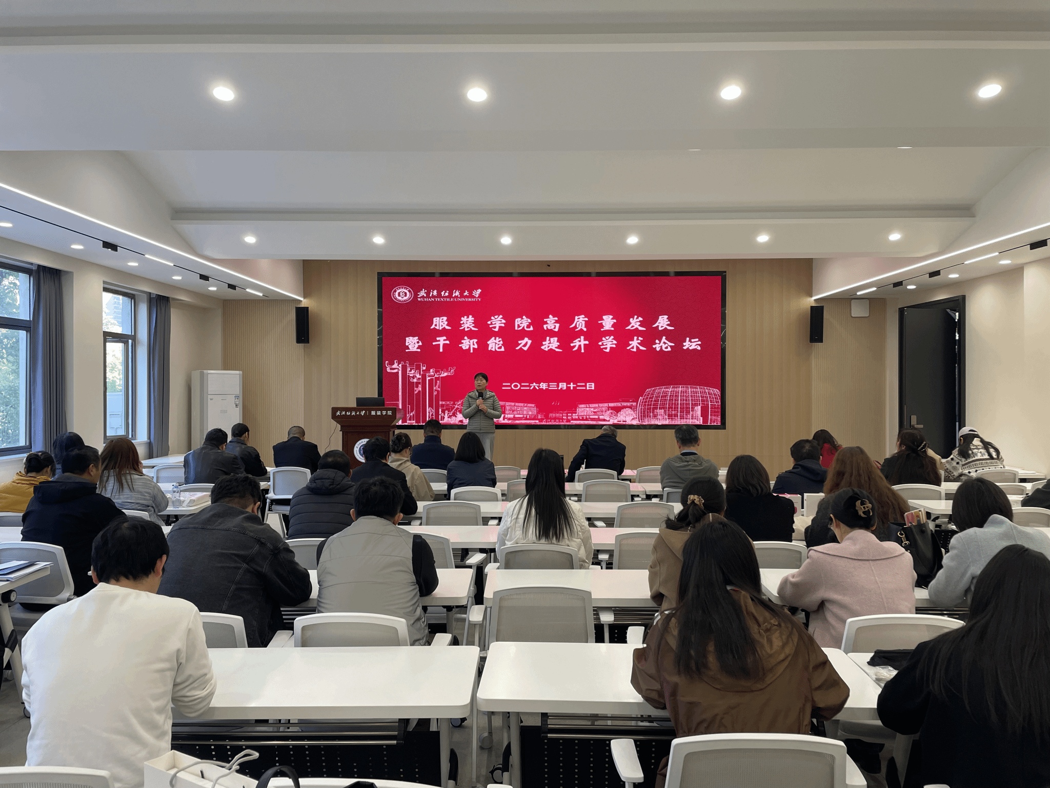 为深入贯彻落实学校2026年“学科建设与干部素质提升年”的工作部署,锚定攻坚路径,将行动转化为发展实效,全力服务学校高质量发展和“十五五”开局工作,服装学院于2026年3月12日下午在南湖校区综合楼二楼报告厅举办了高质量发展暨干部能力提升学术论坛。服装学院领导班子三位副职和五位系部主任,根据学院寒假期间工作部署,聚焦“双一流”攻坚和“十五五”开局,围绕科研创新、教学改革、学生工作与系部建设等重点工作,分别进行了工作思考与汇报,本次论坛旨在为学院新一年的高质量发展谋篇布局,凝聚共识与合力。此次论坛由服装学院院长陶辉主持,服装学院全体教工参加。