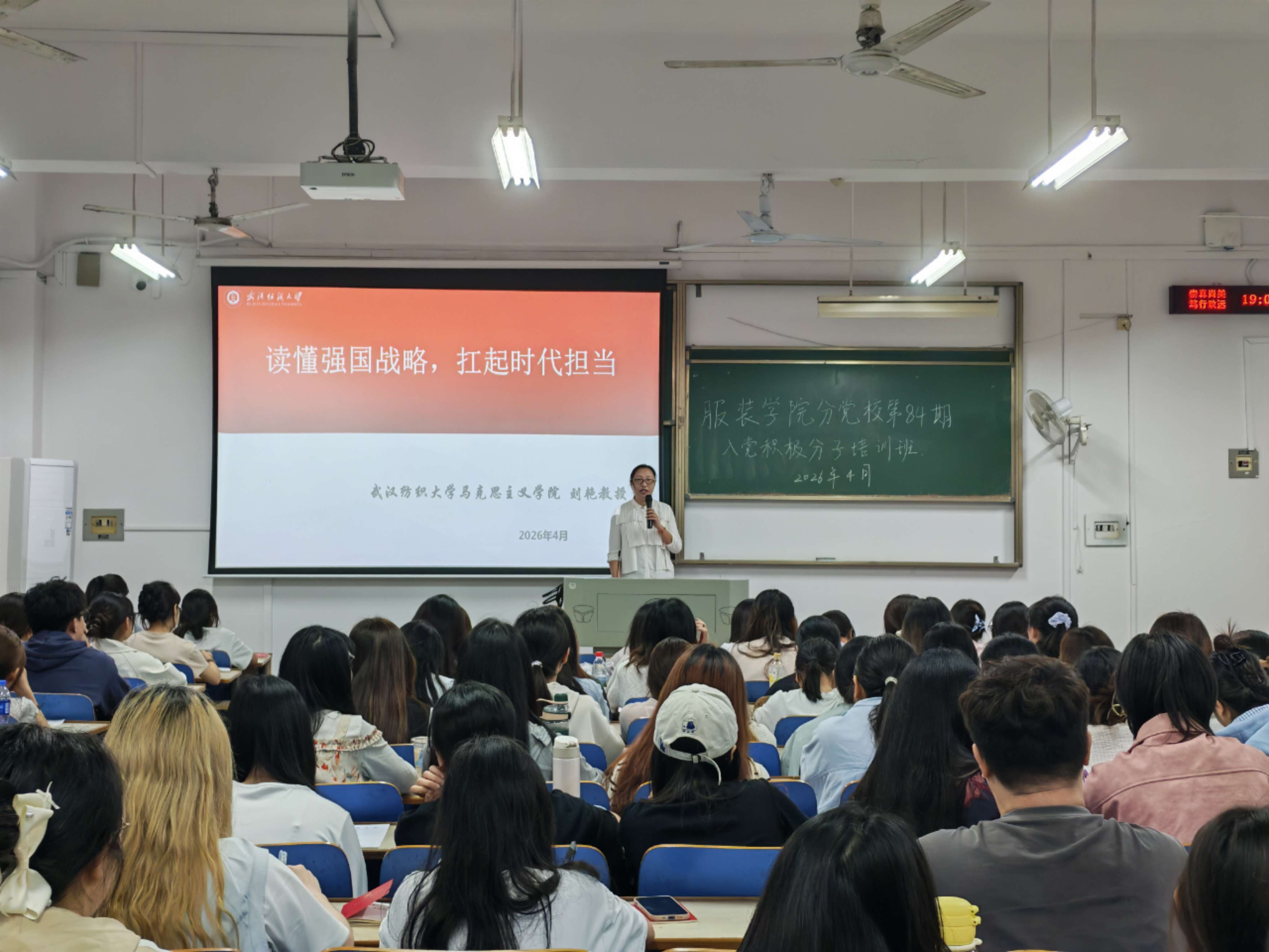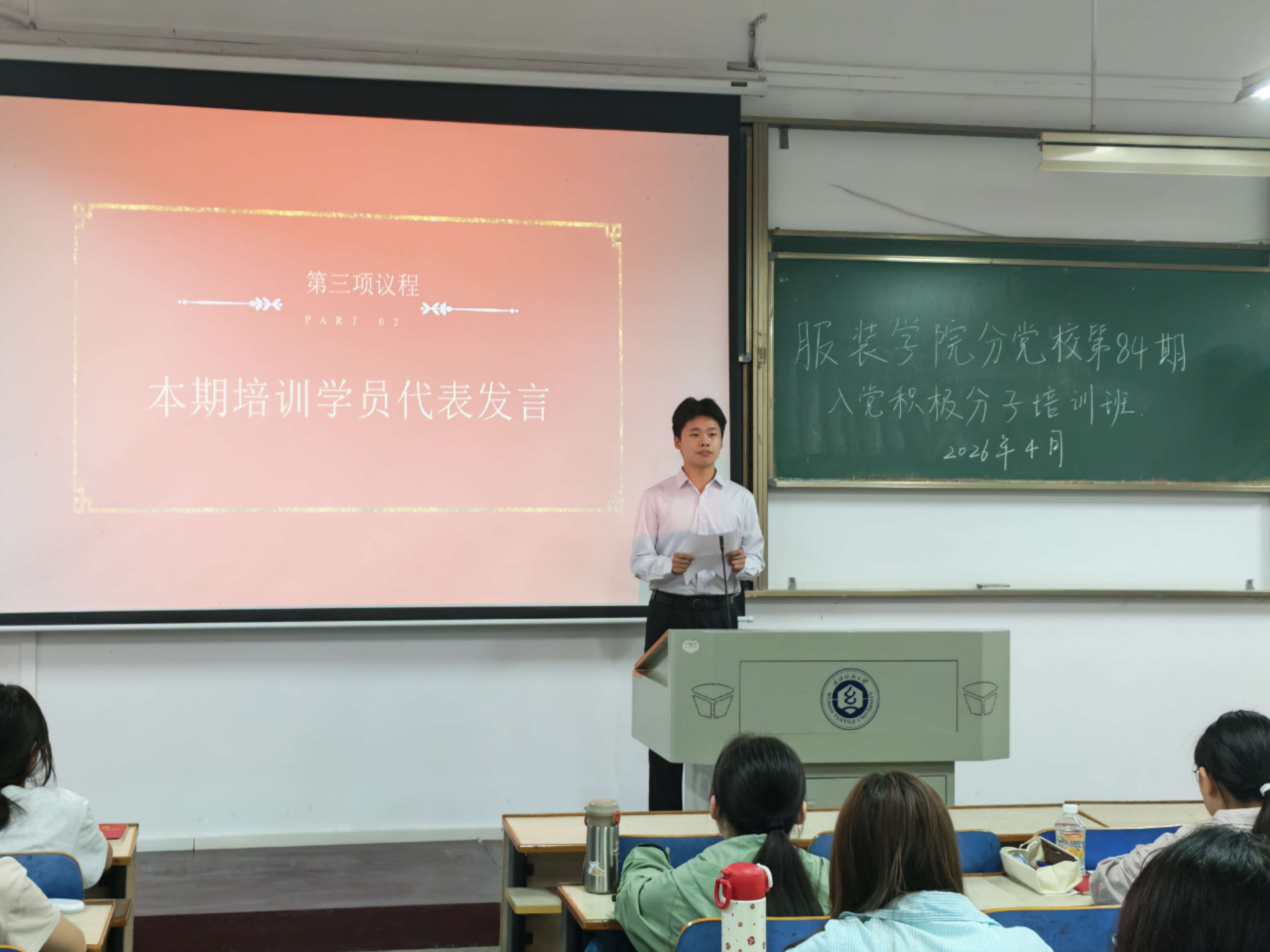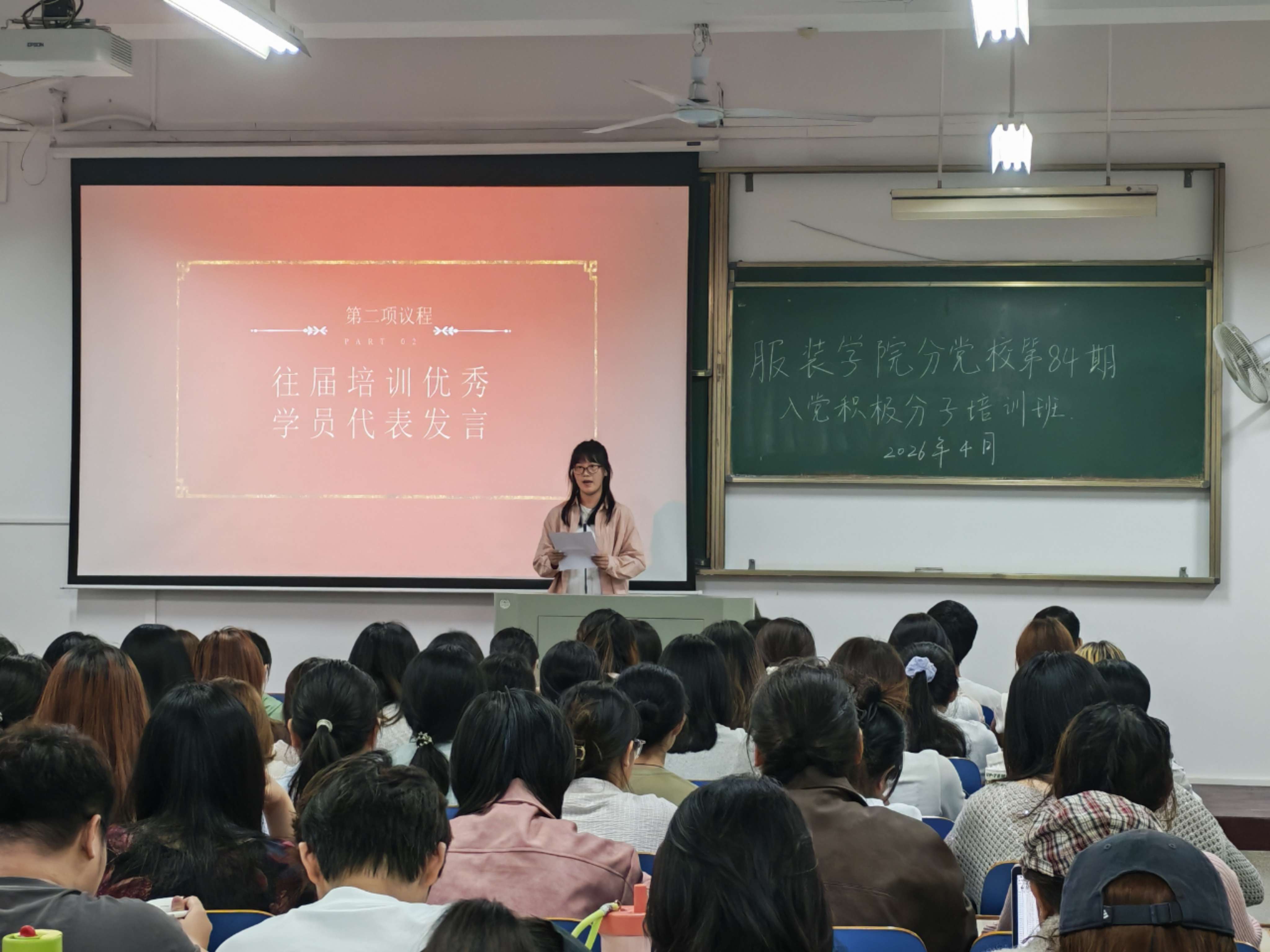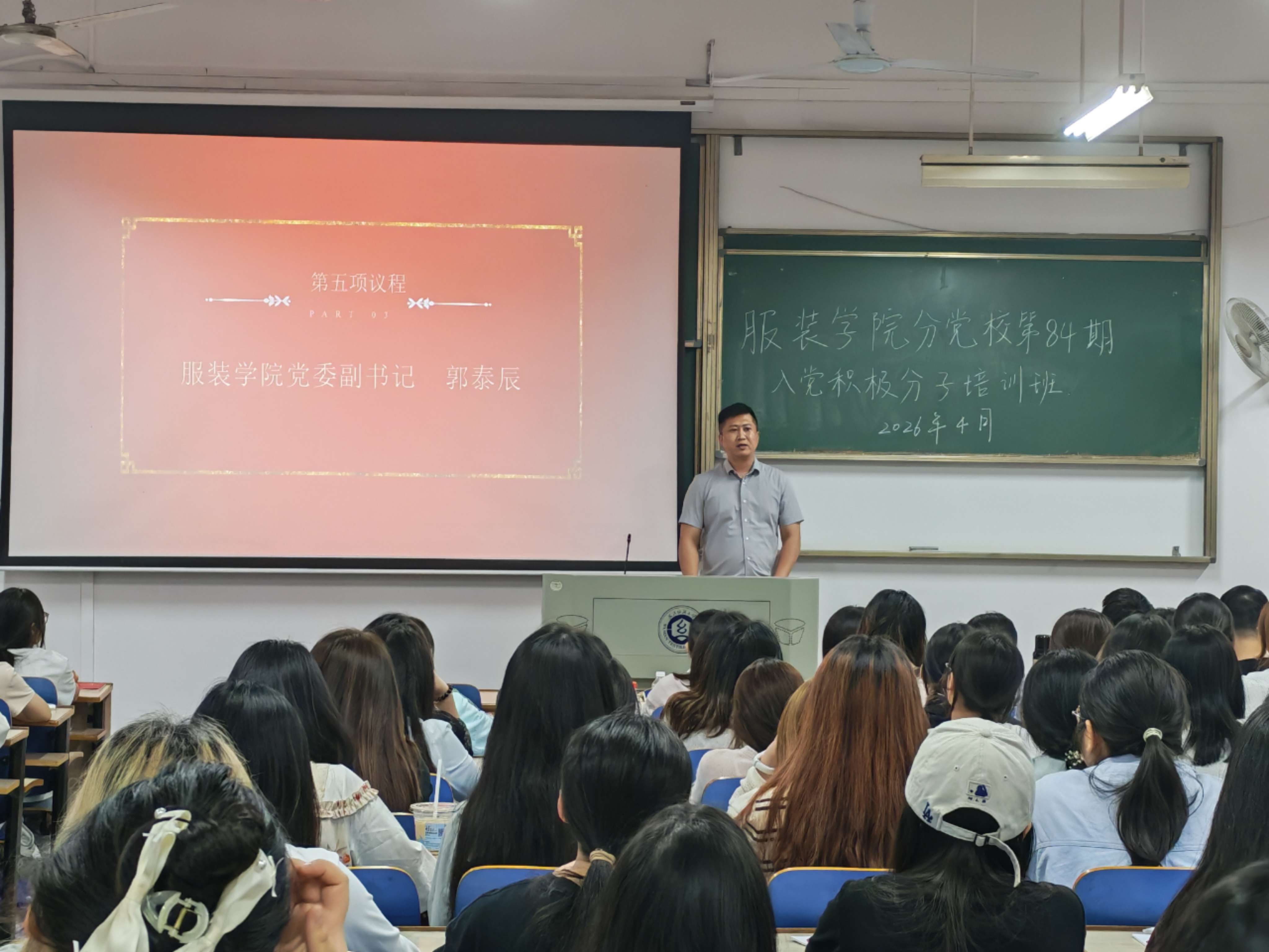 为切实加强入党积极分子队伍建设,提高青年学生的理论素养与党性修养,引导青年学子坚定理想信念、强化责任担当,2026年4月19日,服装学院分党校第84期入党积极分子培训班开班典礼正式举行。服装学院党委副书记郭泰辰、各学生党支部书记、培训班全体学员参加本次开班仪式。