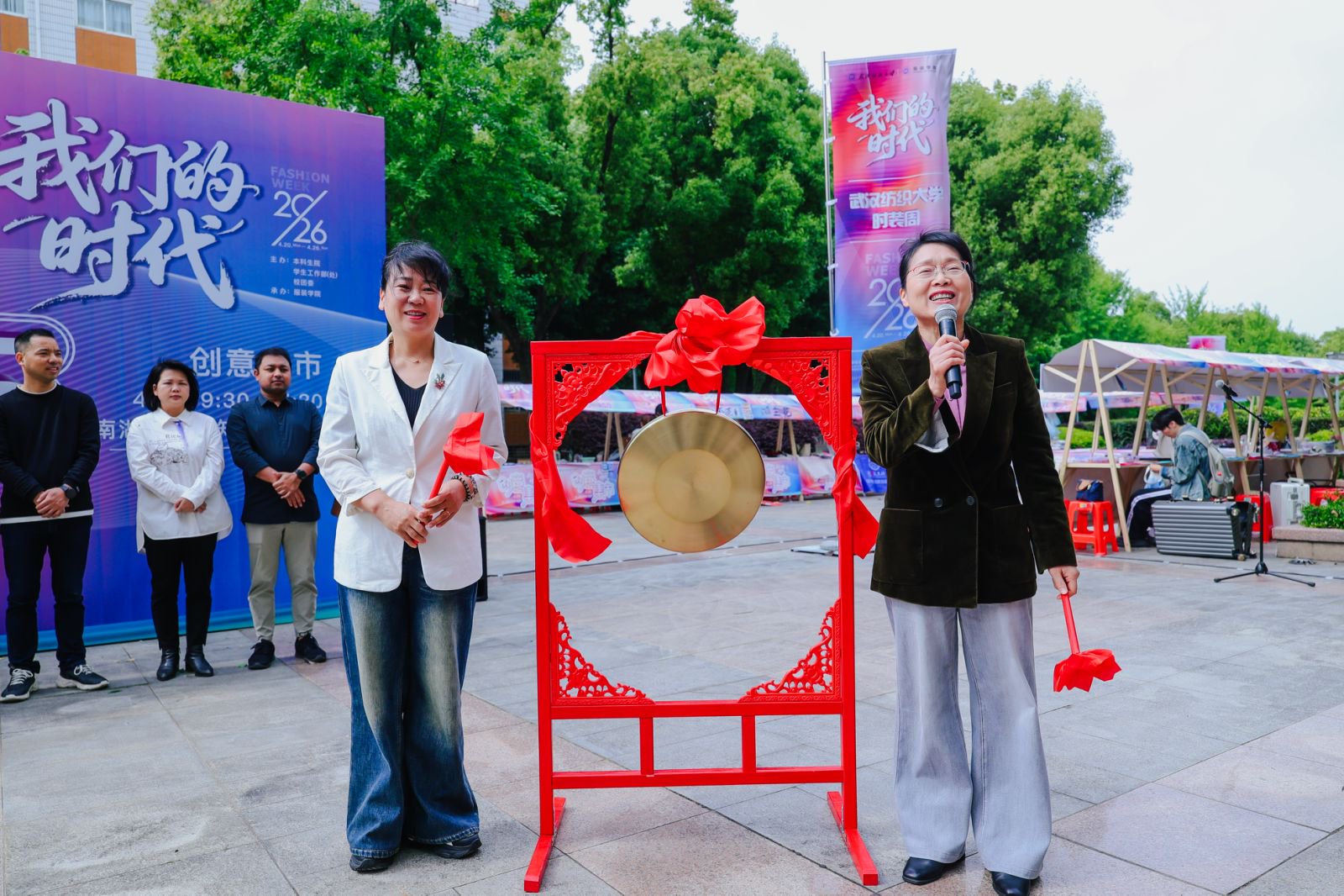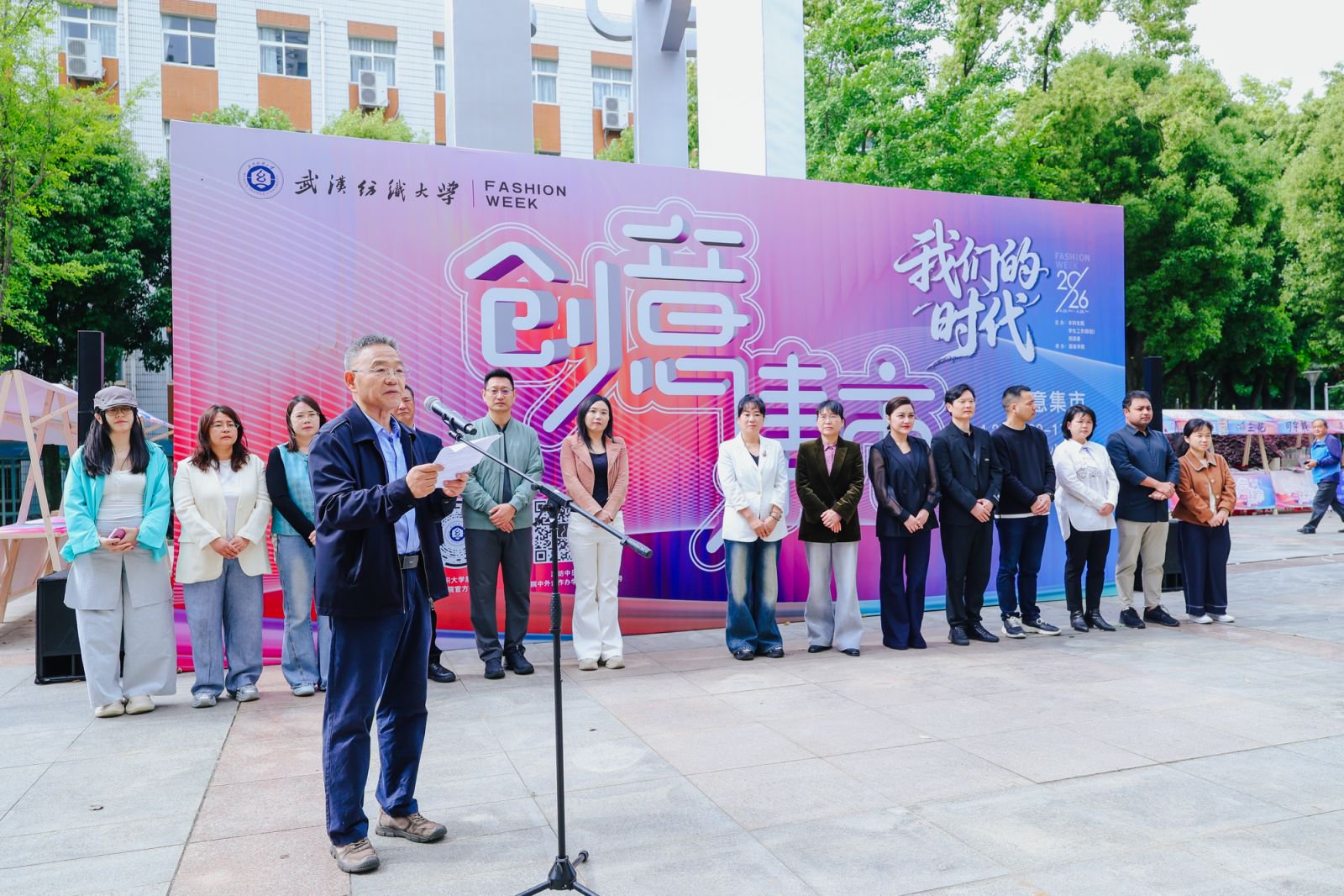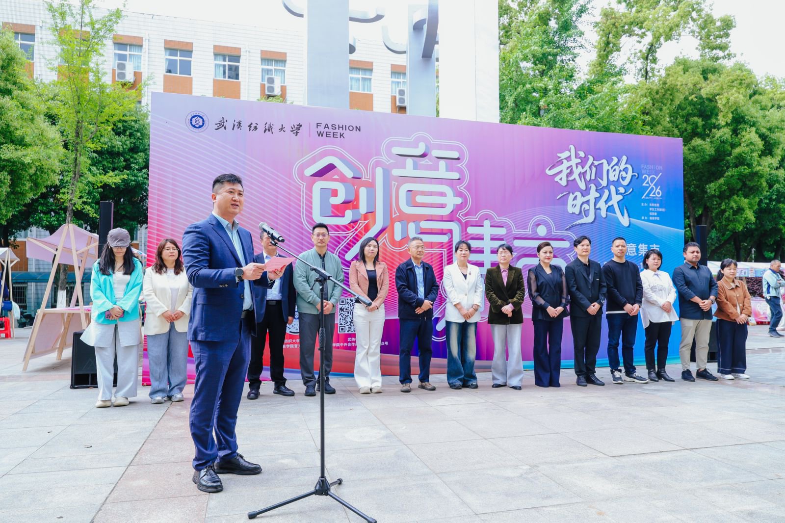 4月20日,武汉纺织大学南湖校区综合楼前广场变身潮流聚集地,2026年时装周核心板块——“创意集市”正式鸣锣开市。37个由在校学生自主运营的创意摊位集体亮相,上演了一场传统与现代、创意与商业、青春与传承精彩碰撞的“赶集”大戏。研究生院常务副院长、研工部部长刘欣,学生工作部(处)副处长朱美龙,校团委副书记侯畅,服装学院全体领导班子成员、系主任、实验室主任、办公室主任和师生代表参加开市仪式,仪式由服装学院党委副书记郭泰辰主持。