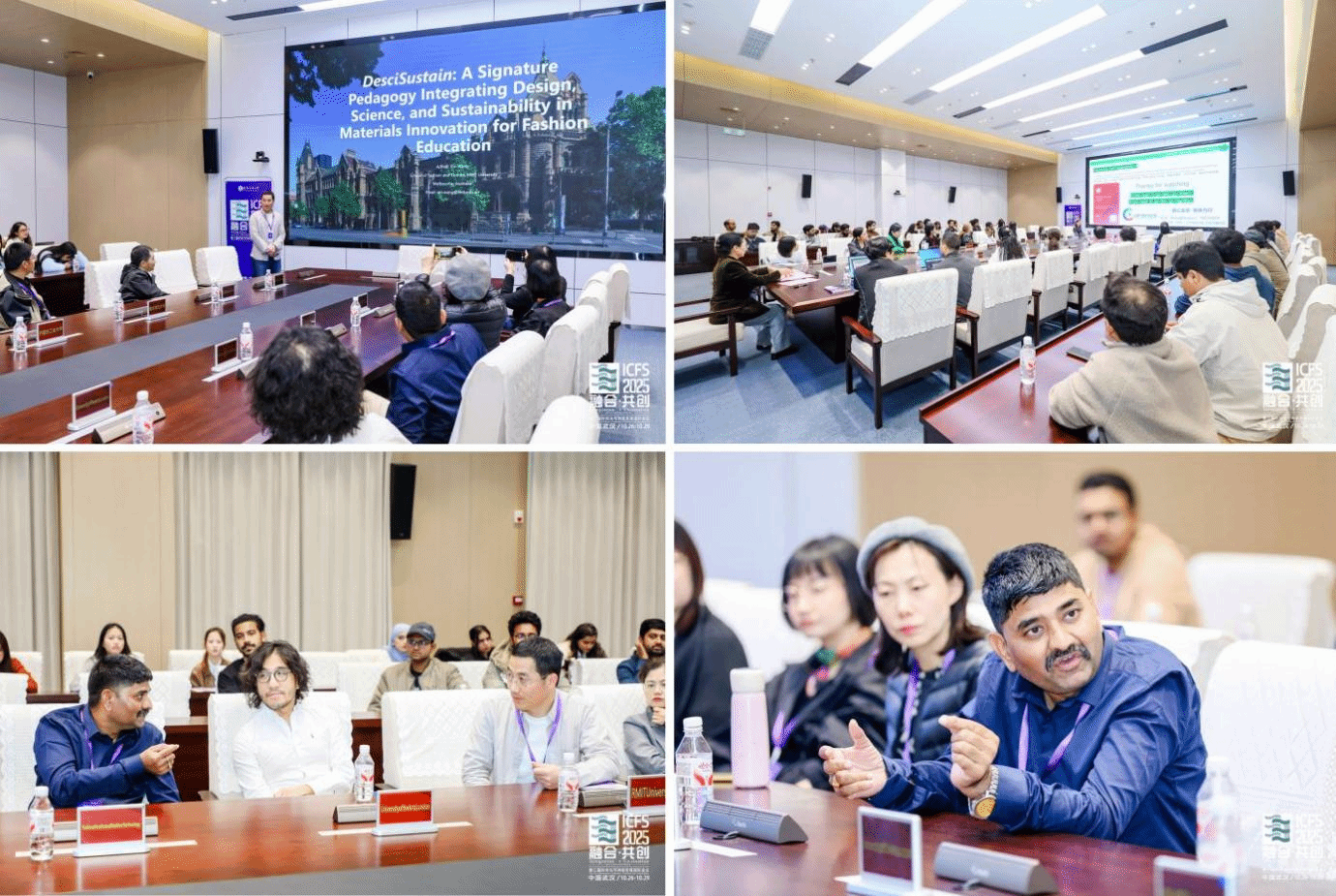 北京服装学院吴琪发表了题为《Sustainable Fashion Education under the Dual-carbon Goals: Full-value-chain Transformation and ESG Talent Cultivation》的专题报告。她结合双碳目标背景,分享了该校在产业链协同教学、ESG人才培养、跨学科实践等三大教学模式创新,并对可持续设计教育提出了具体建议。