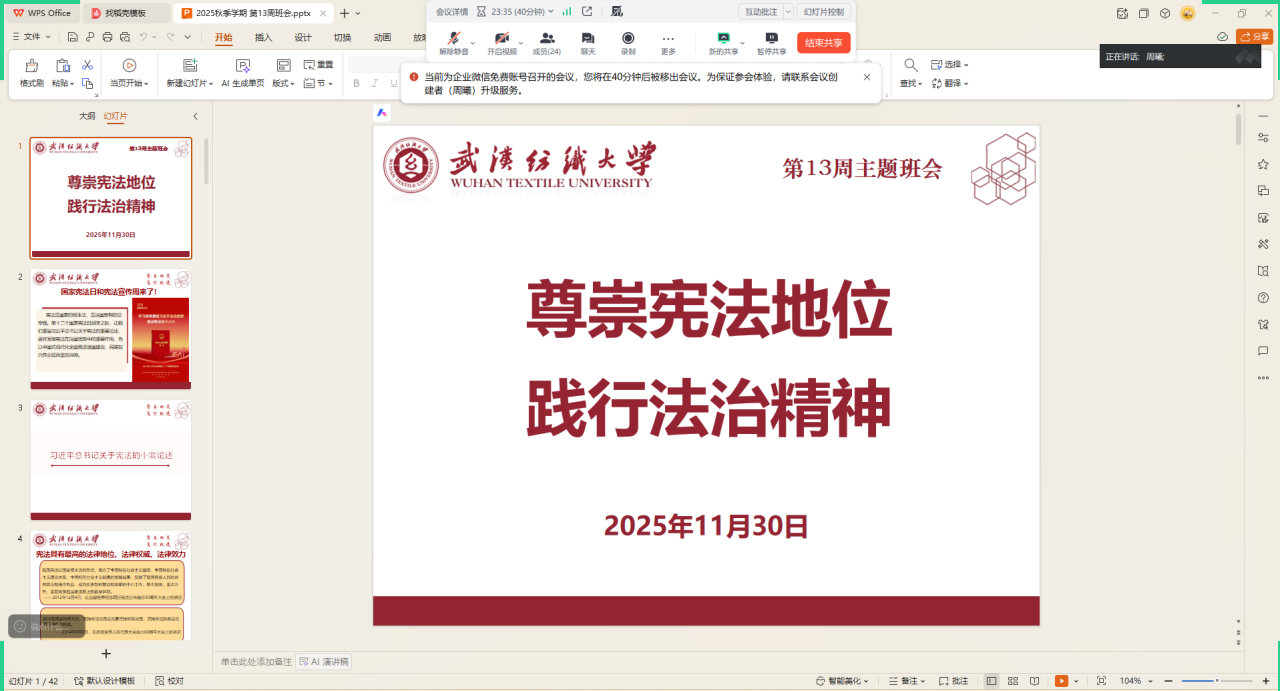 为深入贯彻法治教育要求,落实学院日常管理部署,11月30日,服装学院各班级有序开展第十三周主题班会,围绕“尊崇宪法地位 践行法治精神”核心主题,同步推进晚点名、爱国卫生运动等相关工作,切实筑牢学生思想防线与校园安全防线。
