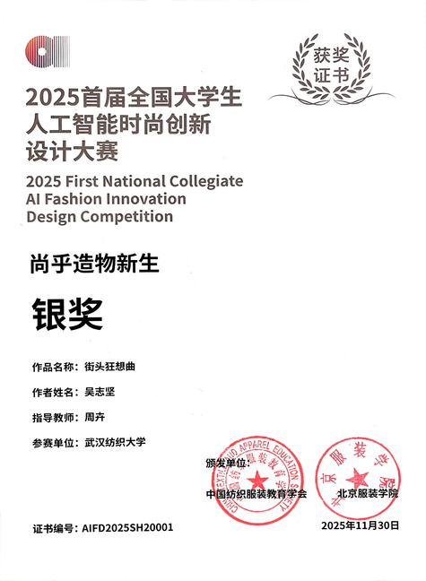 【喜报】服装学院2023级研究生吴志坚在2025首届大学生人工智能时尚创新设计大赛中获银奖