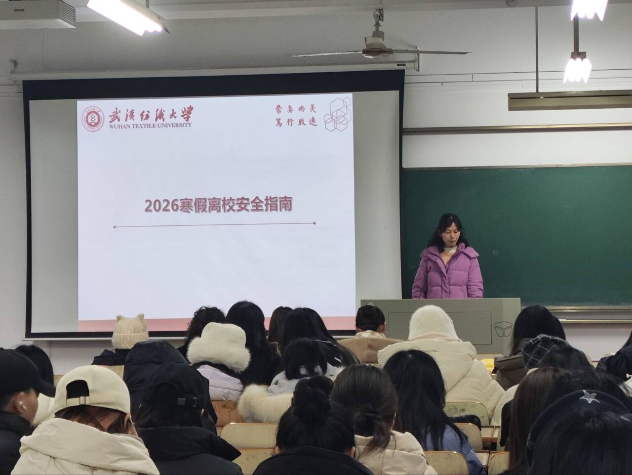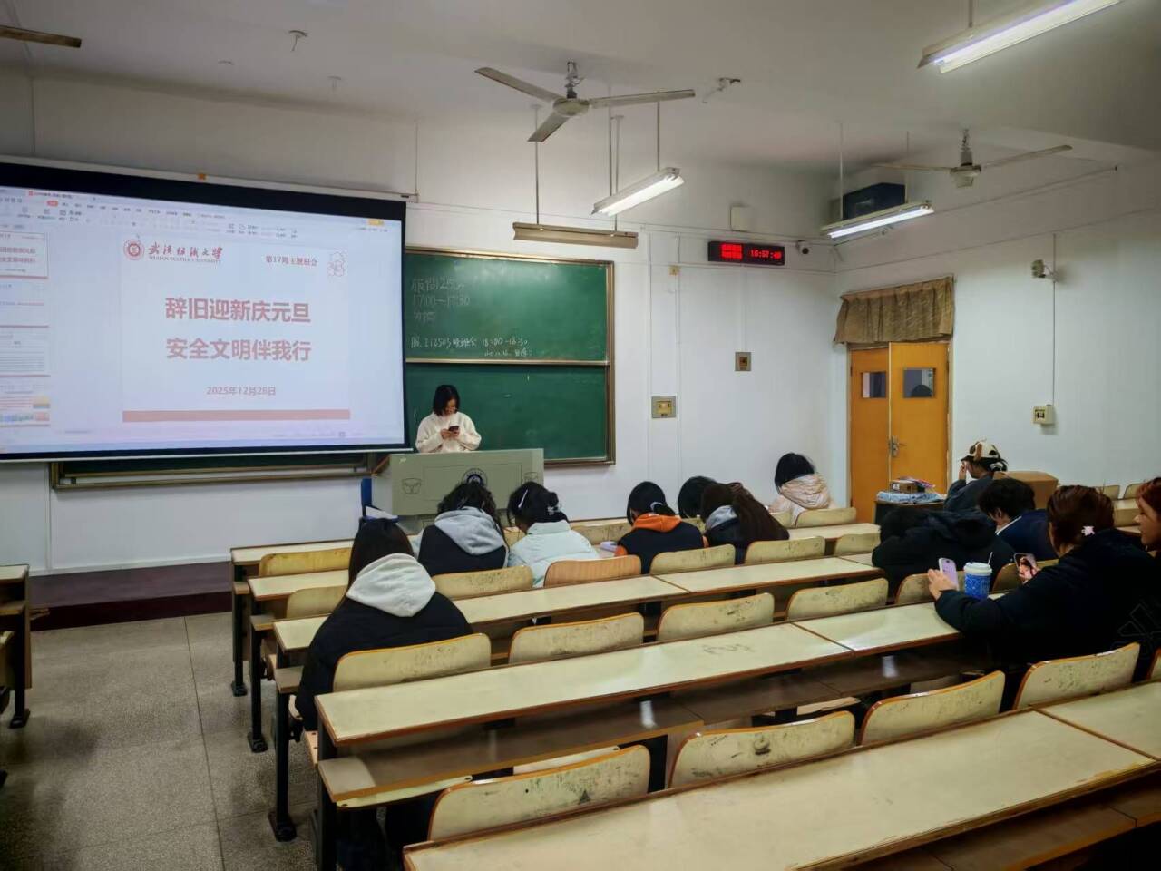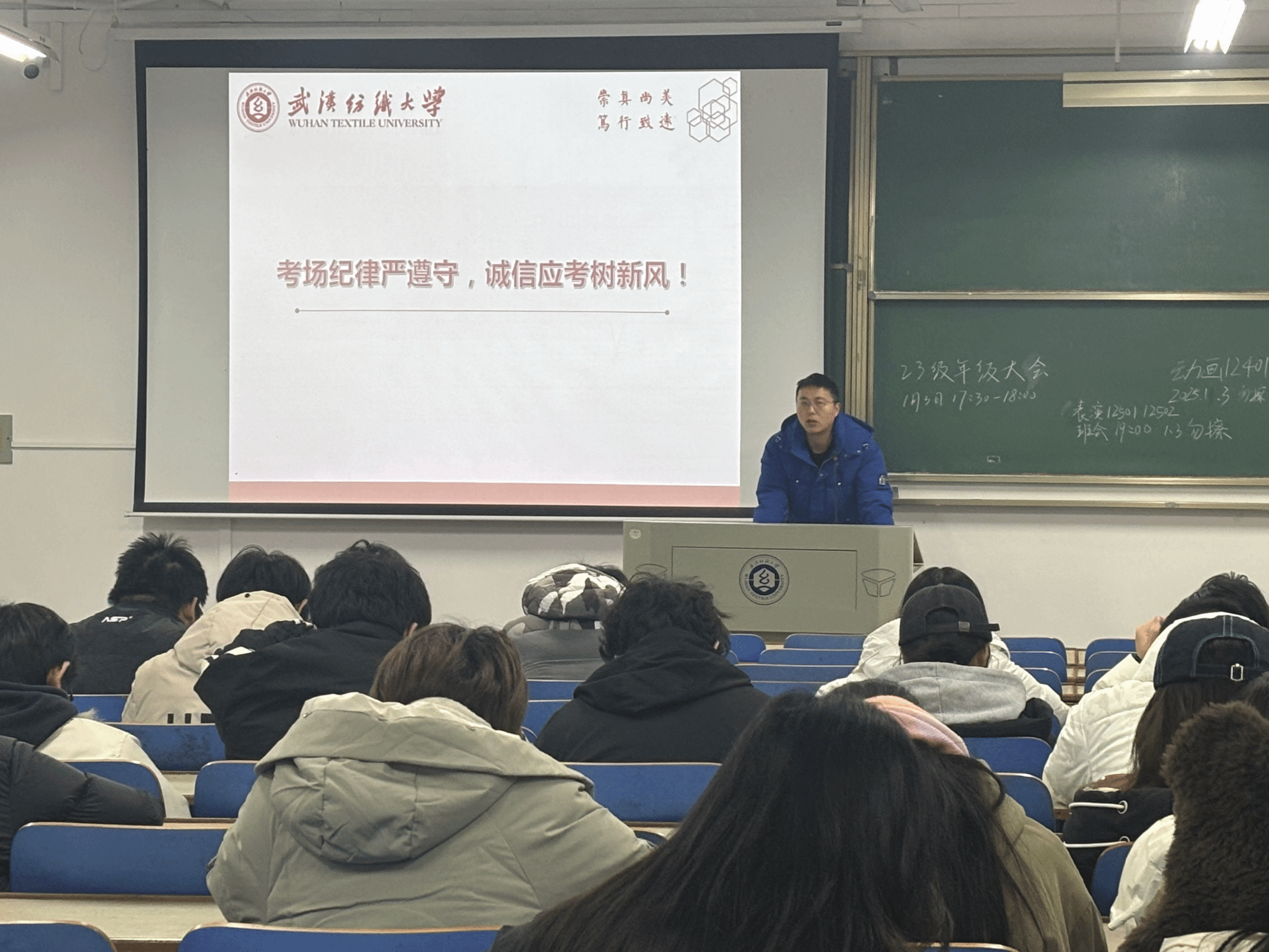 2026年1月3日,武汉纺织大学服装学院各班级以线上线下相结合的形式召开第十八周“奋楫扬帆启新程 诚信应考正学风”主题班会。本次班会紧扣学期末学生管理与思想教育核心任务,将晚点名核查、政策学习、考风教育与安全管理有机融合,为学期收尾工作有序推进和学生寒假安全保驾护航。