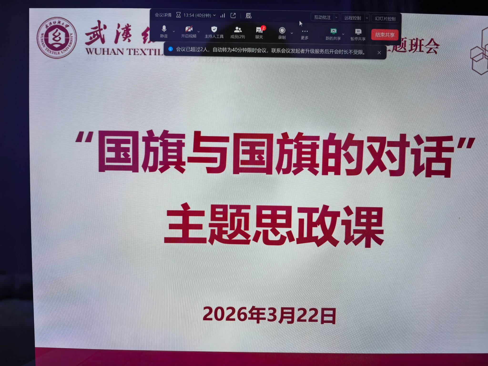 为厚植学生爱国情怀,强化理想信念教育,引导青年学生将个人理想融入国家发展战略,3月22日,服装学院各班级集中开展第4周“国旗与国旗的对话”主题思政班会,以国旗为精神航标,扎实推进思想引领与学风建设深度融合。